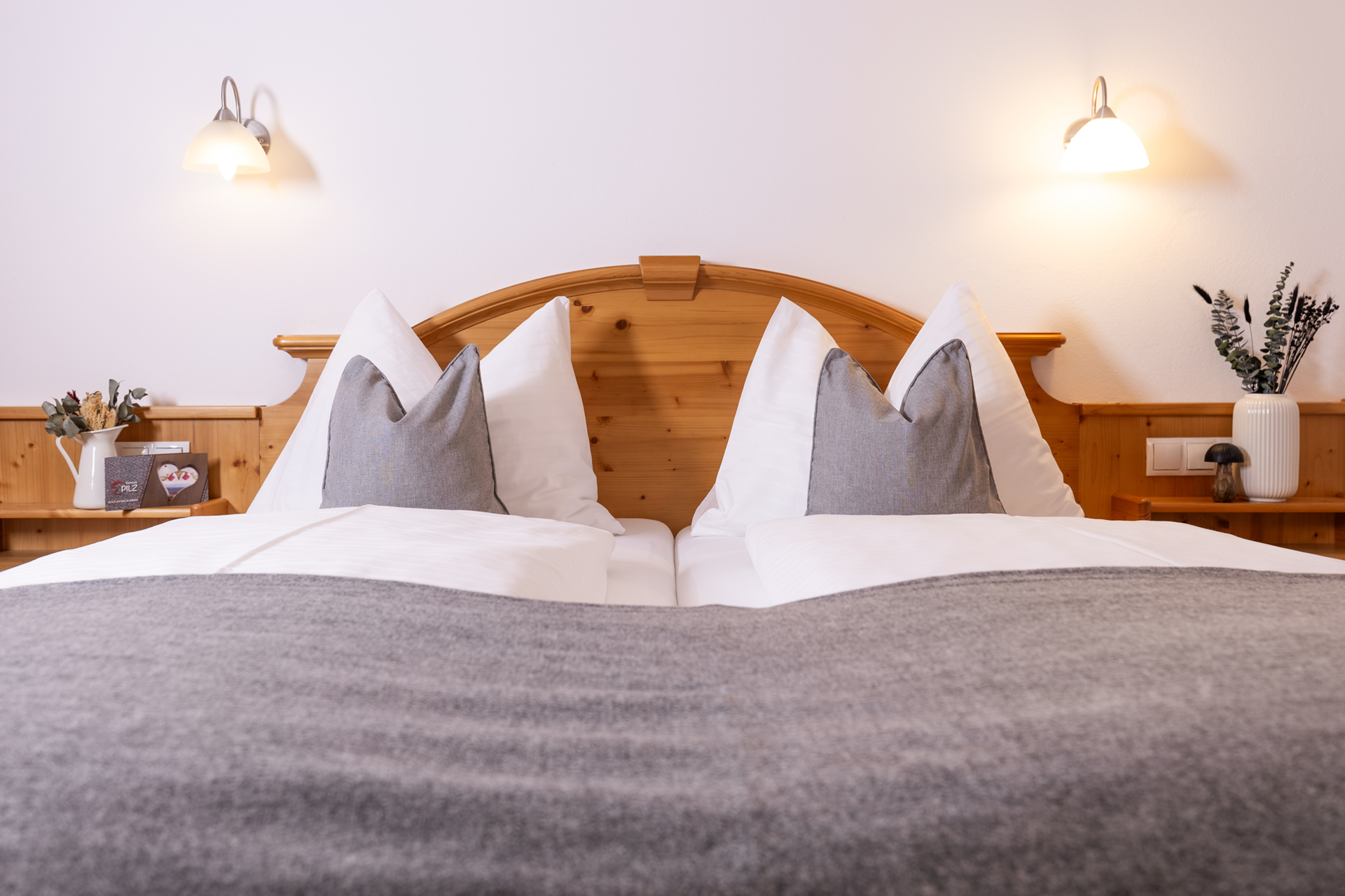 Das Familienzimmer setzt sich aus einem Doppelzimmer und einem Zweibettzimmer mit getrennten Betten zusammen, beide jeweils mit eigenem Bad (DU/WC). Die Zimmer sind durch einen kleinen Vorraum miteinander verbunden. Bei der Einrichtung wurde großer Wert auf regionale Materialien gelegt: Die Möbel sind aus heimischem Fichtenholz gefertigt, während die Bäder mit Fliesen in Holzoptik und Marmor aus der Umgebung gestaltet wurden. Das bequeme Sofa aus traditionellem Schladminger Loden verleiht dem Raum eine gemütliche, rustikale Atmosphäre.